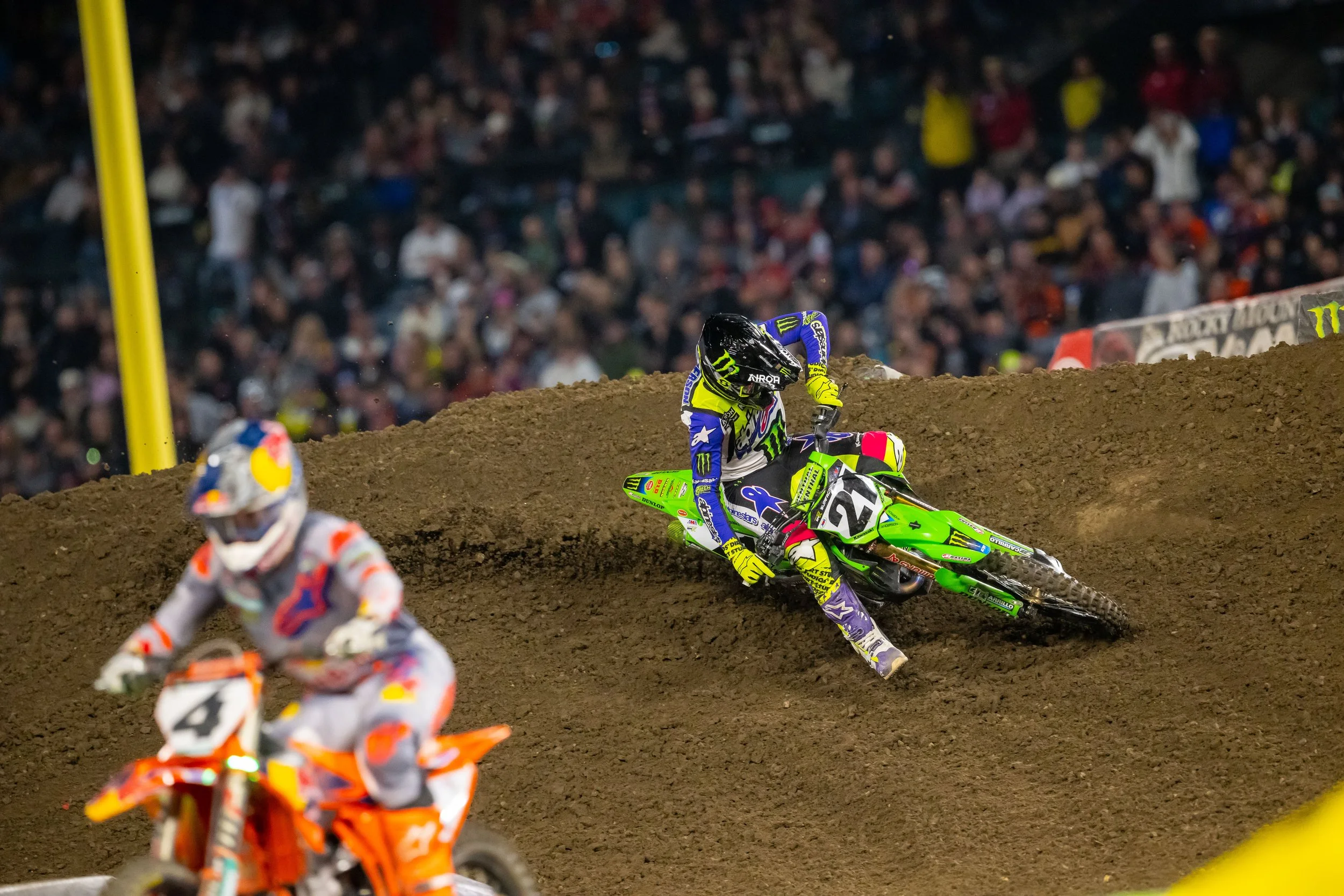 “The whole Monster Energy Kawasaki team, we've been putting in a lot of work. I'm thankful to have them behind me and, yeah, that Main Event was crazy. That first corner, I went in there and I tangled with about everyone. I don't know how I survived. [The contact] ripped some spokes out and I could just see them, like, ticking on my fork. And I'm so lucky that it [the wheel] survived the Main. Yeah, felt pretty good out there, had a lot of moments, and hoping to clean it up and see if we can stay up here on the podium. So, excited for the season.” – Jason Anderson, when asked what it takes to show up with the speed for a Supercross podium.